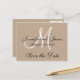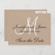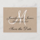 Elegant Monogram Rustic Spara datum vykort. Elke Clarke© för MonogramGallery på Zazzle. Modern, enkel bröllopsannons med tryckt beige kraftpapper fotoeffekt. En vit monograminitial i scripttypografi med svart textöverlägg. Helt anpassningsbar. Andra färger och bakgrundseffekter tillgängliga.