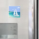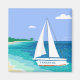 Monogram Sailboat Tropical Beach Magnet. En segelbåt med ditt namn på den närmar sig en strand. Tropiskt havsvy. Blått, teal, havsskum, turkos, grönt, vitt.