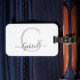 Elegant monogram på din personliga bagagetapp. Vit bakgrund med svart skript och ett silver Monogram.