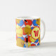 Den här monogramsdesignen av softboll är mycket imponerande och attraktiv och har en röd och blå bakgrund med handskar, softbollar och fladdermus. Visning på ditt skrivbord på jobbet, eller behålla i ditt kök för en varm kopp kaffe. Köp mugg i dag! Bild skapat av: AMBillustrations http://www.etsy.com/shop/AMBillustrations/