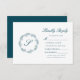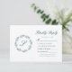 Denna bröllop-utformning har ett monogram av eleganten skript som inledningsvis är inramat av en konsthandning av tealblått blad på vit bakgrund. Orden "Kinly Reply" visas ovanför anpassadets helblå text, som innehåller utrymme för ett alternativ för OSA av online med webbadress.