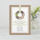 Inbjudan till en uppvärmningspotent med en illustration av en krans med monogrammet med en plan för lila, grönt och orange färg. Utandningsfunktionen är rosettes och hänger från tuggben. Bakgrunden är inkapslad. Anpassa andedräkten med brev från ditt första. Anpassa texten med information om tillfälle.