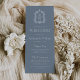 Det här elegant-vintage-inspirerade bröllopsprogrammet innehåller ett par vitt mongram initialer i ett öppet serif-teckensnitt ovanför och under en skiljelinje och omges av en botanisk vapensköld på en dammig blå bakgrund.