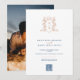 Monogram hjärta krona med bär och löv som är inringade i vapensköld bröllop porträtt fotoinbjudan i ro guld, vitt och rik mörk blått text. Anpassa med dina egna uppgifter om initialer och bröllop, QR-kodlänken och fotot på presentationen. Ursprunglig hand teckning och utformning av Sarah Trett för www.mylittleedenweddings.com