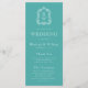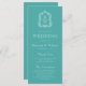 Det här elegant-vintage-inspirerade bröllopsprogrammet innehåller ett par vitt mongram initialer i ett öppet serif-teckensnitt ovanför och under en skiljelinje och omges av en botanisk vapensköld på en turkobakgrunden.
