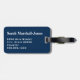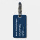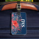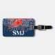 Bagagetagg med vattenfärgsblommor av blommigten blå denim och blommor av röd ros, inledande mongram/namn och uppgifter av adress på marin blå bakgrund. Anpassa med dina inledande/inledande/inledande/inledande/namn, namn och adress med hjälp av de enkla mallarna. Teckensnitt färg, typsnitt stil, storlekt typsnitt och marin blå bakgrund färg är anpassade. Perfekt för varje respåse.