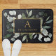 Introducing our Monogram Watercolor Tropical Green Leaves Black Bath Mat. Featuring watercolor illustration of greenery bouquet arrangement with customizable monogram on the middle in gold color. Suitable as a housewarming gift or for nature lovers.