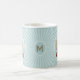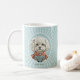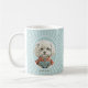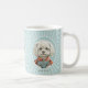 White Bichon Frisé hund med en superhjältedräkt innesluten i ett ovalt ram, med text under bilden. Både mittbilden av hund och texten på framsidan och baksidan kan ersättas med ett eget foto och en egen text. Ett monogram är ställe mitt i mugg och kan vara personlig. Underbart vykort för djur älskare.