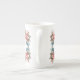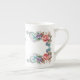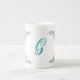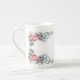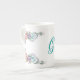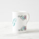 Elegant, vitt benben china mugg, med grafik av färglöst blommigt och ett enda brev monogram på framsidan. Matchande tekruka finns tillgängligt.