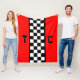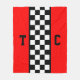 För tävla fläkt har den här filten en serie svarta och vita checkar nedåt i mitten och initialer, så att du kan anpassa dig, på båda sidor med en röd bakgrund.