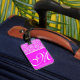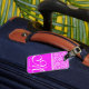 rosa rosa och vit stapel av eko-rutor mönstrad med bagagemärke i monogrammet med läderband