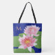 En elegant och trendig Tote Bag, med två rosa vattenliljor på en djup blå bakgrund, från en vattenfärgsmålning av Judy Adamson. Det finns utrymme på den blå bakgrunden för att lägga till ditt namn, inledande eller andra anpassningar.