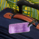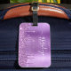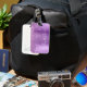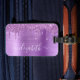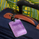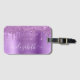 Monogrammad elegant bagagetagg med lila faux glitter som droppar mot lila faux borstad metallbakgrund. Anpassa med ditt namn i ett vitt skript för trendiget snyggt med dekortecken.
