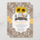 En söt solros och mason skorrar inbjudningskort för möhippan med två solrosor och en märkre som kan vara monogrammed med initialer av bruden och brudgummen. Det bruna banret, som något att sägakärlek är i blom, kan personifieras med ditt egna uttrycka. Burlapen och fauxen utföra i relief damastast snöredesignen för look är perfekta för ett land, ladugård, eller lantligt themed bröllop eller par duschar. Skräddarsy baksidaen av inbjudan med ditt egna uttrycka på den gult sydde bandlookdesignen. Planlägg © Chrissy H. Studio, LLC. All reserverad rättigheter.