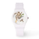 En söt och kawaiiapa hänger upp och ned från ett blad gren och träd med en banan i handen på en grädda och vit strimlad bakgrund. Den här djungeln och safari-temat kan vara personlig med ditt monogram, initialt eller valfritt brev. Art © Chrissy H. Studios, LLC. Alla Höger reserverade.