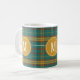 Snyggt teal, orange och brun twill i mönster mugg. En vit brev som är centrerad på alla tre sidorna av kaffe eller te mugg är lätt att anpassa med ditt monogram. Gör en underbar husuppvärmningsgåva.