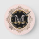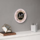Skapa din egen trendiga boho-märkt väggklocka i rosa och guld - Svart cirkel med monogram i mitten i falskt guld och blekt rosa, både monograminitial och namn i skrivstil och en traditionell bokstav. Inramad av vacker guldmetallisk blommande mandala. Guldmetallisk klocka visar siffror. Med matchande rosa bakgrund. Verkligen en unik klocka. Chic, personlig boho-hemdekor. Skulle vara en söt present vid bebisflicka shower eller visas i en bebisflicka-rum, tonåring flickors rum eller flickors sovsal, också.