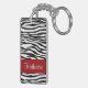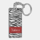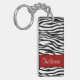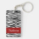 Svartvit zebra ränder för stilfulla och moderiktiga zebra ränderkeychainsärdrag och en röd brytninggränsram upplysningsvis på bekläda och baksidaen. Tillfoga din initiala eller annan text för namn. Visa din personlighet med denna roliga och moderiktiga keychain. Gör en underbar gåva för tillfällen. Klicka "skräddarsy den!", knäppas för att ändra stilsortsformatet, stilsortsfärgen, stilsortsstilen och mer!
