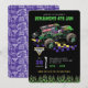 This high-energy Monster Jam–inspired design features the iconic Grave Digger monster truck racing across a bold black background with neon green flames, purple accents, and a dynamic checkered flag pattern. The powerful truck illustration is front and center, creating an action-packed look that feels fast, loud, and exciting. Bright green lettering and vivid purple details add to the adrenaline-filled theme, making this design perfect for kids who love monster trucks and thrilling races. Personalized event details like the name, age, date, time, and location are clearly displayed, making the design both fun and functional for a memorable monster truck–themed birthday celebration.