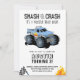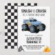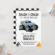 En monster truck inbjudan, med en blå monster truck med flammor. Redigera texten så att den kan användas för din fest.