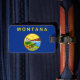 Inom försegla vilar en plog, en skyffel och en plocka i ett fält framme av de underbara nedgångarna av Missouriet River. Bandet innehåller den statliga mottoen, den Oro y plataen (spanjor för "guld och silver"). Strömflagga adopterades i 1905, och ord "Montana" ovanför försegla tillfogades i 1981. I 1985 ändrades flagga igen för att specificera stilsorten som användes i "Montana: " Helvetica djärvt. För den adopterades som en statlig flagga, användes den av Montana soldater som utplacerar för det spansk/amerikankrig.