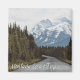 Ta en Montana-väg resa längs denna motorväg, som är uppbyggd med högt, vintergrönt träd med stora berg täckta av snö vid horisonten. Bilden fångades i Glacier National Park. "Montana Road Resa" är skrivet i vitt skript i det nedre Lämnat hörnet.