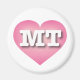 Den här magneten har en lugn, coola och ett insamlat rosa hjärta med ett vitt tvättat centrum som innehåller det feta, vita, övre fodral brev MT, officiellen för Montana, skatttillståndet.