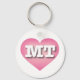Den här nyckelringen har en lugn, coola och ett insamlat rosa hjärta med ett vitt tvättat centrum som innehåller fetstil, vit, övre brev MT för fodral, officiellen för Montana, skatttillståndet.
