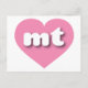 Det här vykortet har ett dynamiskt hjärta för rosa som innehåller det feta, vita, rundade nedre brev mt i fodral, en lekfull förkortning för Montana, skatttillståndet. Baksidan av vykortet är tom och väntar på din anpassade text eller dina handskrivna känslor.