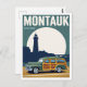 Capture the classic coastal style of the Hamptons with this striking Montauk, New York, travel poster! This stylized design features the iconic Montauk Lighthouse silhouetted against a large, full moon, with a beautiful vintage Woody Wagon parked prominently in the foreground. Rendered in a cool, limited color palette, this print evokes the luxury and nostalgia of mid-century coastal road trips. It makes an excellent piece of wall art for a beach house, car enthusiast, or anyone who loves the East End of Long Island.