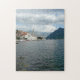 En vacker panoramisk syn på byn Perast i Montenegro tryckt på ett pussel.