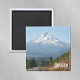 Fyrkantmagnet med en scenbild av snö-socklade bergskorgens Huva och Huvans flodddal i Oregon. Gör en underbar resande souvenir!