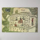Vintageillustration Antik världskarta med en del av aztekernas imperium i centrala Mexiko med ett tempel i mitten som troligen användes för människooffer. Kyrkan eller templet är omgivet av en kyrkogård med gravstenar och kors. Cirka 1577. Aztek refererar till mexica-folket i Tenochtitlan, nu platsen för Mexico City.