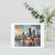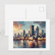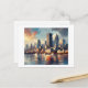 Ett landskap med skyscraper och en klassisk arkitektur, som återspeglas i en stillastående kropp i vatten. Himmel är fyllt med vibrerande färg av solnedgång, vilket ger uppvärmning till scenen.