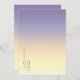 Bakgrunden till alla biet i denna minimalistiska bröllop-uppsättning är en öga-fångstgradient av färg från indigo till persiko och palmast gult. Det här bröllop-kortet "Spara datum" har ett elegant, modernt layout och contemporary som sans serif-teckensnitt för att öka dess underskattade elegans. Lägg enkelt till datumet namn och bröllop med hjälp av den angivna mallen. Sök-ID741 om du vill visa hela uppsättningen med matchande produkter i Indigo Sunset eller välja en av de andra tillgängliga övertoningskombinationerna till kostym-paletten för bröllop färg.