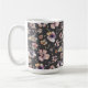 Moody Boho Watercolor Blush Wildflowers Pattern Coffee Mug to start your day right. A perfect gift for someone who loves a moody romantic vibe. Coordinating with a range of home decor products using the same design and colors, this moody, dramatic botanical pattern features lush watercolor wildflowers in soft blush, lavender, and peach hues, set against a deep charcoal grey background. The high-contrast design captures the spirit of Dark Academia and Maximalist decor, offering a sophisticated, luxurious touch for your home decor. The painterly style and rich color palette ensure a beautiful, high-end look."