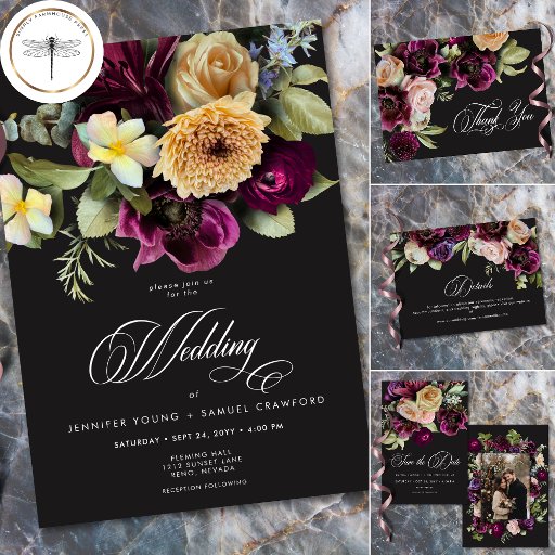 Moody Dark Floral Black Burgundy Romantic Wedding Inbjudningar