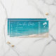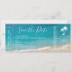 Beach Destination Wedding Save the Date Card som ser ut som ett boardingpass för Flygplan Biljett har en djup teal och turkosa blå moody tropisk havs- och mjuk sandstrand med vinkart krasch till stranden, och avslappnad och roligt modern typsnitt i en enkel utformning. Det finns plats på baksidan för rese- och inkvarteringsinformation som tillval så att dina gäster kan få upptagen med att boka resa.
