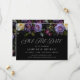 Elegant moody blommigt bröllop spara datum med en gräns av lila, elfenben och blommor med lush grönt blad och mörk. "Spara datumet" visas i elegant, modern typografi. Anpassa den lila blommigten sparat datumet med namn, datum och plats för bröllop och bröllop webbplats. Kortet återgår till visning av vågräts förlovning-foto i svart med lila blommigt med mönstrad bakgrund. Utformningen koordinerar med vår Moody samling av Gothic Blommigt bröllop.