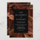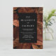 Denna moderna botaniska inbjudan har en mörk, en moody bakgrund av höst löv i rost. Anpassa den med namnen av bruden och trippen och andra detaljer om bröllop i vitt på en svart rektangel. Bilden av rost löv upprepas på baksidan av kortet. Idealisk för ett fallbröllop!