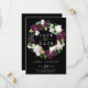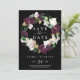 Detta moody svarta spara datum meddelande-kort för lila är perfekt för ett modernt bröllop. Blommigten för elegant har mörk lila av plommon och vita tulpanblommor med emerald grönt löv och guld löv accents.