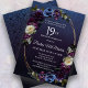 Sofistikerad och moody mörk lila ro och vilda blommor skapar en blommigt för chic. Humle av vitt och blått ger visuellt intresse och djup. Frukt och bär bidrar till att förbättra sulfatets utformning. Tillsammans dekorerar de en elegant med flera strand och ovala guld ram. Inbjudan tillbaka har en subtil geometrisk vintage mönster. Denna 19:e födelsedagsinbjudan ingår i den Moody samlingen av Blommigtar för Lila. Den innehåller mallar som du kan använda för att skapa en unik inbjudningssvit, samt mallar för välkomsttecken, party-artiklar och dekorationer.