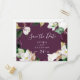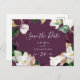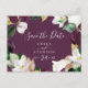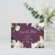 Den här moody lilan blåser plommon för att spara det datum då vykortet är perfekt för ett modernt bröllop. Blommigten för elegant har mörk lila av plommon och vita tulpanblommor med emerald grönt löv och guld löv accents.