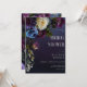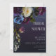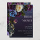 Den här möhippans inbjudan är utformad med en mörk, moody marin blå bakgrund med en vacker blommigt av lila, maron, vit och periwinkle blue med mörk grönt blad och mörk lila bär. Skapat av Farmhouse Press.