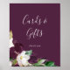 Den här stämningsfulla skylten med lila blommor och texten "Blomkort och gåvor" är perfekt för ett modernt bröllop eller brudfest. Den eleganta blomdesignen har mörka plommonlila och vita tulpaner med smaragdgröna blad och guldbeläggning. Textraden längst ner på skylten kan anpassas med datumet, brudens och brudgummens namn eller ett kort meddelande som "Tack". Skylten kan användas för ett bröllop eller någon annan tillställning eller fest.