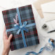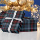 This exquisite wrapping paper features a dramatic and moody tartan plaid in a sophisticated color scheme. The primary colors are a blend of slate blue/dusty navy and deep black/charcoal, punctuated by bold, striking crosses of rich burgundy or deep red. This upscale and trendy design is perfect for those seeking a modern, unconventional Christmas or a luxury, gender-neutral look for winter celebrations. Choose this compelling plaid for a memorable and highly fashionable presentation of gifts for all ages.