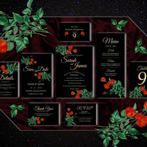 Set a dramatic and luxurious tone for your special day with our 'Moody Starry Night & Crimson Roses' wedding invitation. This design features a deep royal black background reminiscent of a mystical starry sky galaxy, creating a sophisticated and romantic atmosphere. At the corners, lush and vibrant crimson red roses add a touch of timeless elegance and Victorian charm.