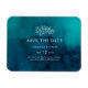 Detta moody havsvattenfärgsflexibla spara datum magneter är perfekt för din tropiska boho bröllop. Det är designat med minimalistiska vita tropiska löv och en häpnadsväckande bakgrund av mörk blått grönt.