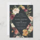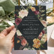 Elegantens bröllopsinbjudningar i blommigten innehåller dina uppgifter som är inkapslade i en långdragen diamant omgiven av vattenfärgen ro, morsa och grönt i rustik höst i färg, inklusive persikor, elfenben, , burgat och grönt. En rik med svart bakgrund lägger till djup och elegans till chicens inbjudan till höst- eller vinterbröllop.