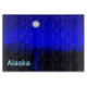 Moonrise in the Inside Passage utanför Alaskas jacka. Bergen i avstånd och en fiskebåt går norrut. Texten "Alaska" visas i blått och vitt.